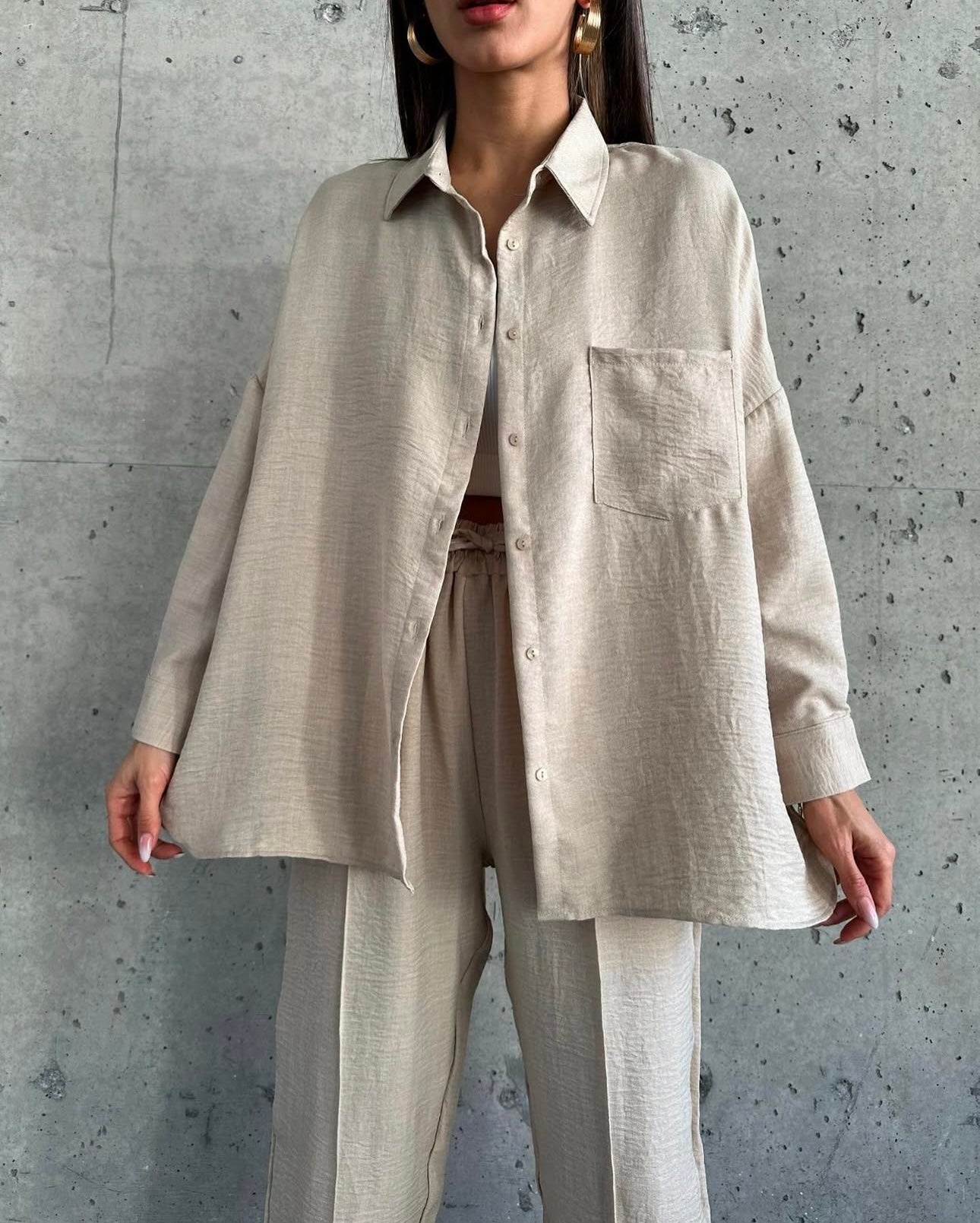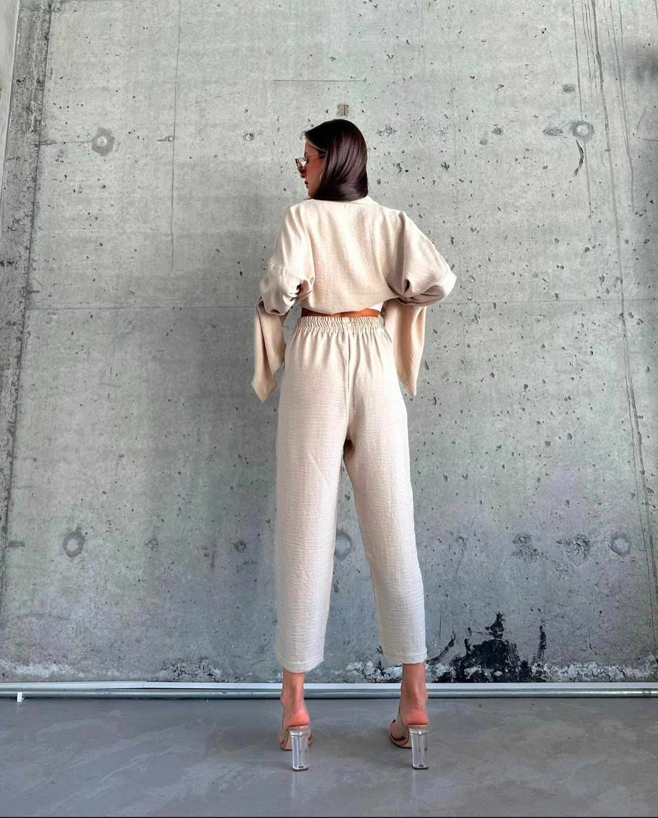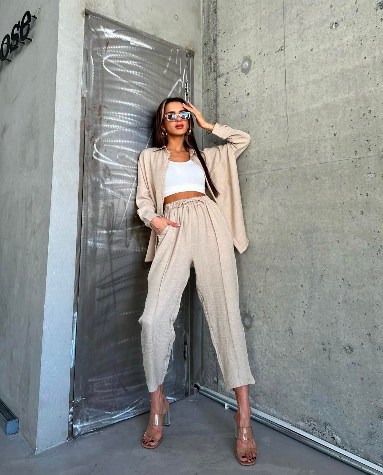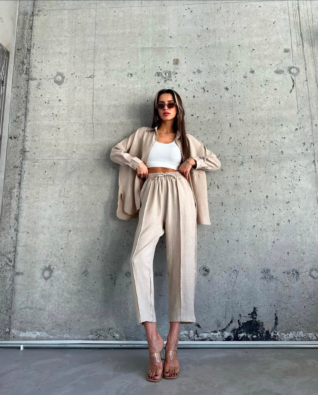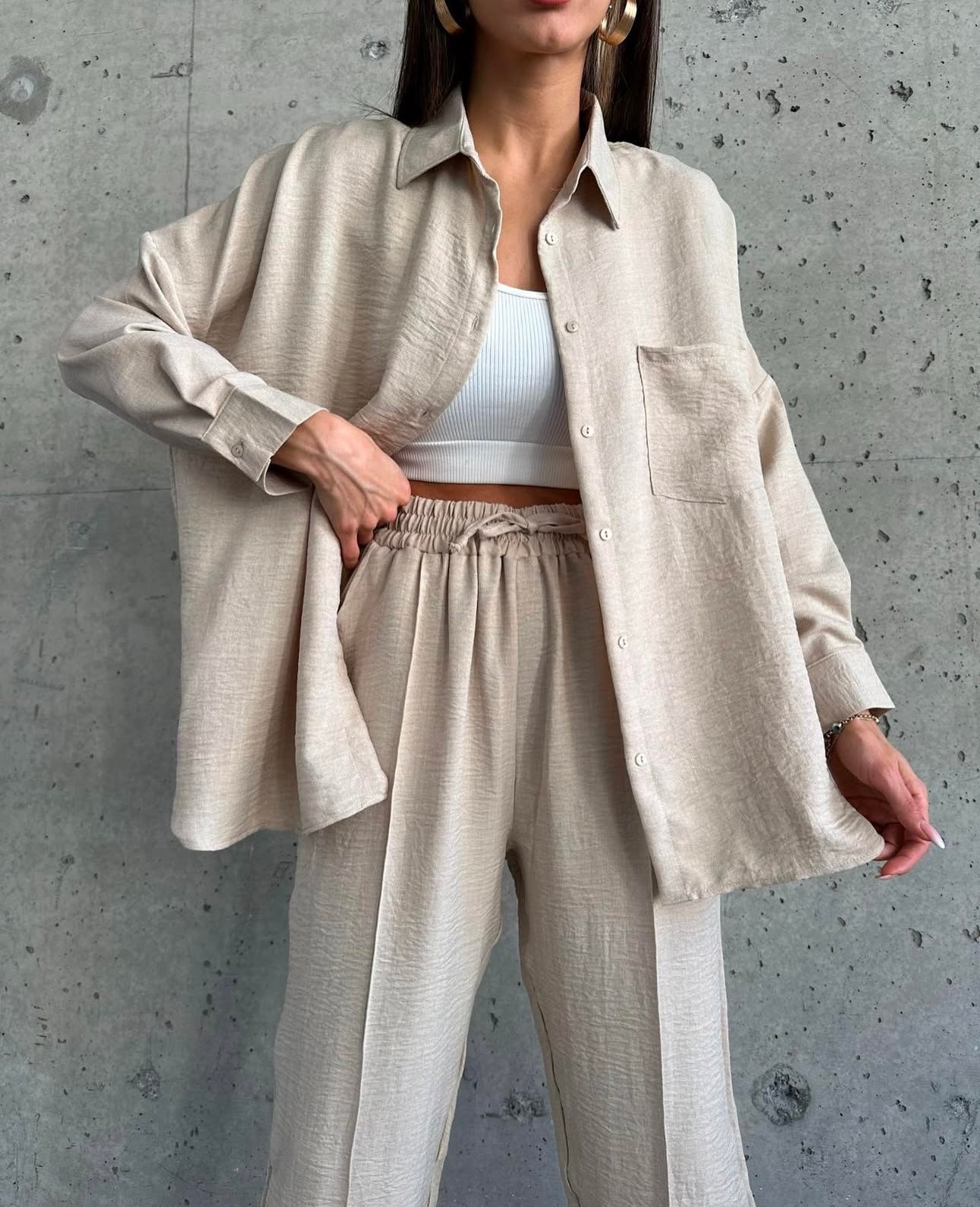 Leichtigkeit trifft Stil – dieser Zweiteiler im Leinenlook ist dein idealer Begleiter für warme Tage, ob im Büro, beim Brunch oder beim City-Walk.